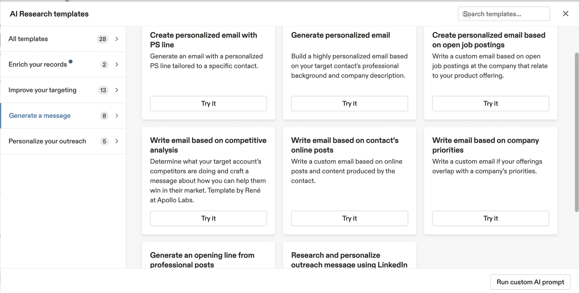 Developers are trained to think in terms of syntax and functions: if X, then Y. This approach is excellent for building a CRM but disastrous for building human relationships. When a developer writes a tool or a prompt for a salesperson, it usually results in something that functions but does not necessarily align with the salesperson's goals. For example, in Apollo.io, you can use custom prompts for every row in a database. You can ask if a lead's company offers B2B or B2C services or generate a message for a specific person.